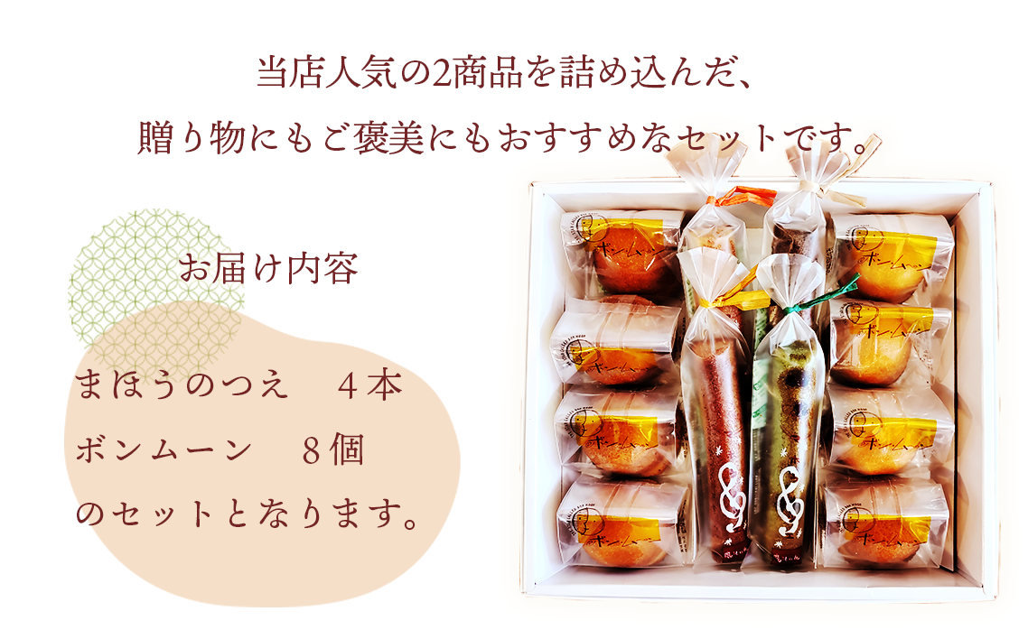 | 消費期限 | 賞味期限:ボンムーン、まほうのつえ共に商品発送日より14日 |