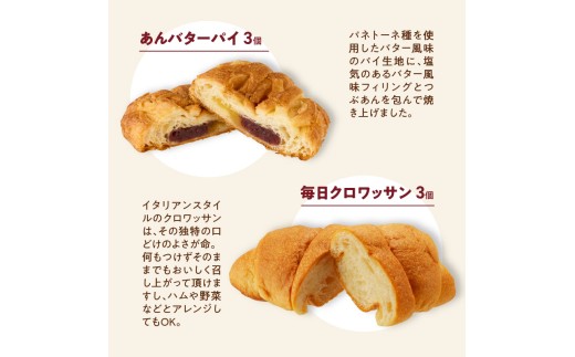 容量 | クリーム小町3個 デニッシュチョコ3個 あんバターパイ3個 毎日クロワッサン3個 黒糖クロワッサン3個 |