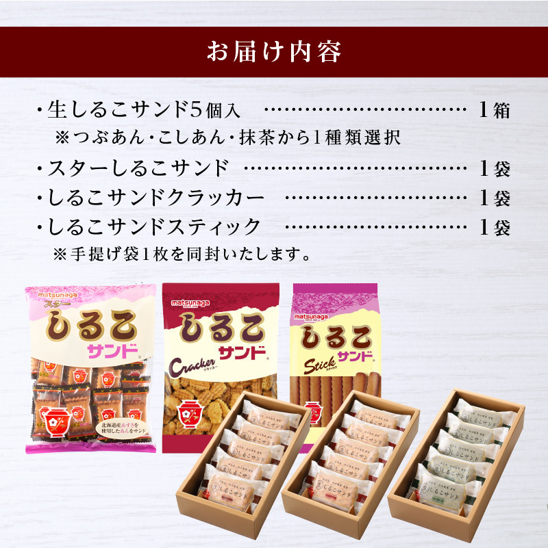 | 容量 | ・生しるこサンド5個入(つぶあん・こしあん・抹茶から1種類選択):1箱 ・スターしるこサンド:1袋 ・しるこサンドクラッカー:1袋 ・しるこサンドスティック:1袋 ※ご寄附1件につき、手提げ袋1枚を同封いたします。 |