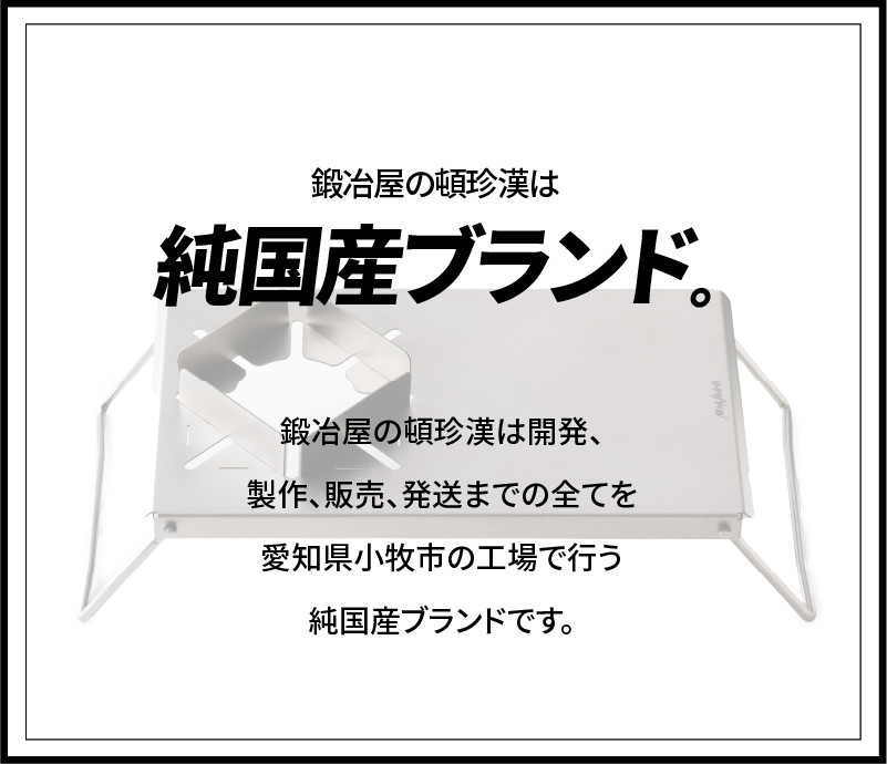 折り畳み式脚により折り畳んだ時の厚みは15mmなのでとてもコンパクトでA4サイズに収まり持ち運びも便利です。 テーブルは鉄板等から飛んだ油がガス缶や周りに付着するのを防ぐことができ、バーナー使用後の後片付けがとても楽になります。 本製品は国内の工場にて職人がひとつひとつ製作しています。