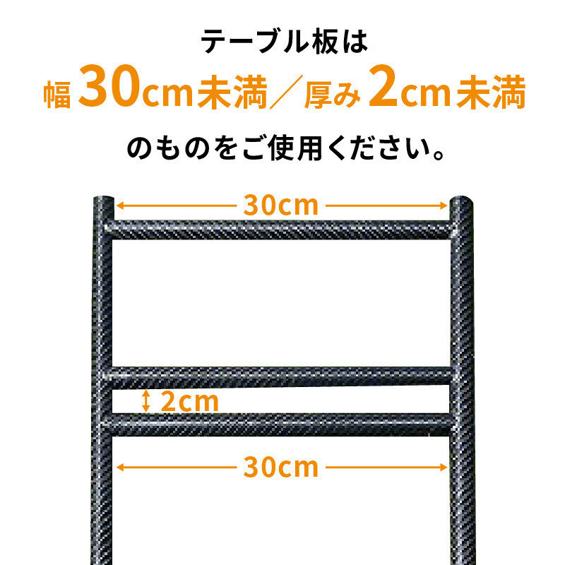 | 容量 | カーボンレッグ 2脚 ■サイズ:102 x 35cm ■材質:3Kカーボンファイバーチューブ ■重量:約2,600g (2脚) ※テーブル板は付属しません。 |