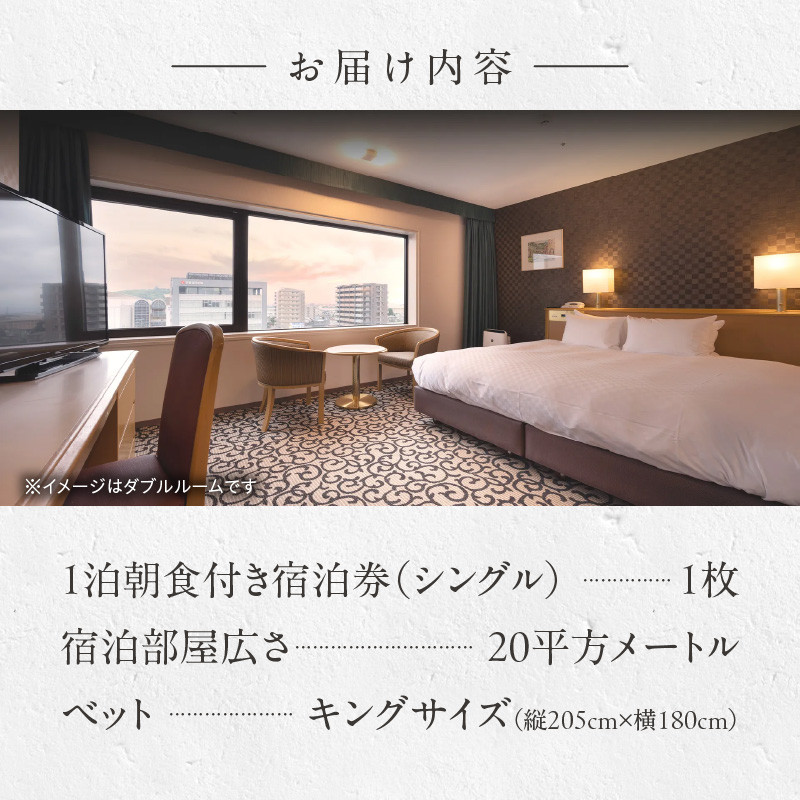 | 容量 | 小牧市観光や出張にオススメ 1泊朝食付き宿泊券(シングル)×1枚 宿泊部屋広さ:20平方メートル ベットサイズ:キングサイズ(縦205cm×横180cm) |