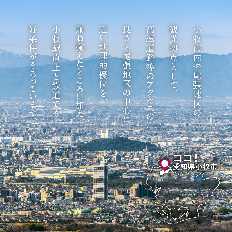 小牧市内や尾張地区の観光拠点として、高速道路等のアクセスの良さと尾張地区の中心に近い地理的優位を、兼ね揃えたところに加え、小牧駅直上と鉄道でも好条件がそろっています。