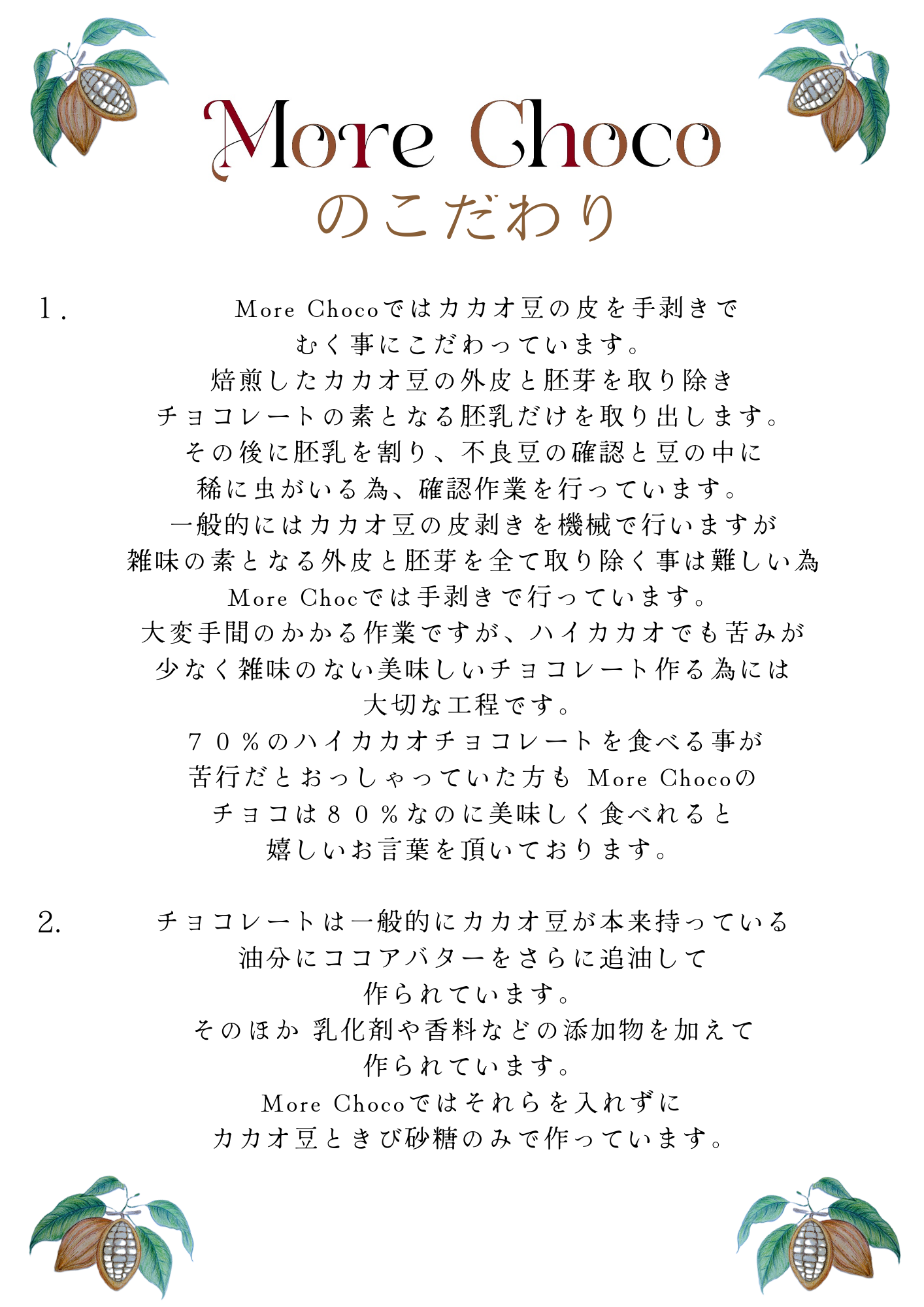 カカオ豆は一つ一つ丁寧に外皮と胚芽を取り除き、品質の良いカカオ豆を選別しています。雑味の元になる外皮と胚芽を取り除く事でカカオ豆の持つ個性がより引き出され産地ごとの味わいを楽しむ事が出来ます。