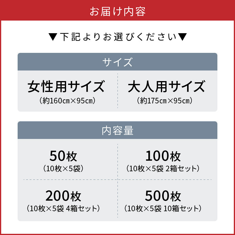 | 容量 | 不織布マスク 50枚入(10枚×5袋)×10箱 ※ご希望のサイズをお選びください。 サイズ:女性用 約160cm×95cm/大人用 約175cm×95cm カラー:ホワイト 層:三層式 素材:本体 ポリプロピレン・ポリエチレン、ポリエステル(不織布)/フィルター ポリプロピレン(不織布)/耳ひも ポリエステル、ポリウレタン/ノーズワイヤー ポリエチレン |