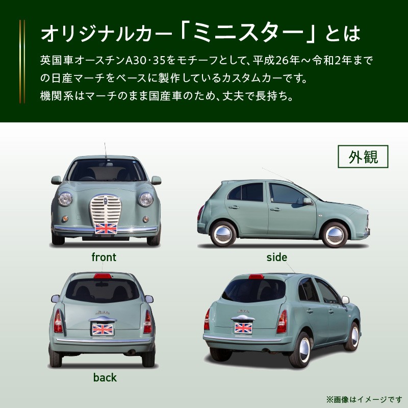 『ミニスター』は平成26年~令和2年までの日産マーチ(K13系)をベースに製作している英国車風カスタムカーです。
