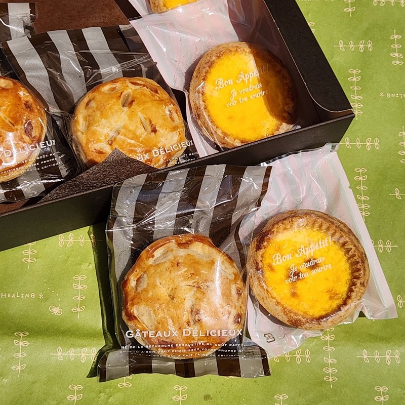 アップルパイと、エッグタルトの詰め合わせです。どちらもバターのみを使用した手作りパイ皮を使用しています。