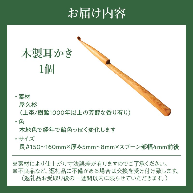 | 容量 | 木製耳かき 1個 ・素材:屋久杉材(上杢/樹齢1000年以上の芳醇な香り有り) ・色:木地色で経年で飴色っぽく変化します ・サイズ:長さ150~160mm x 厚み5mm~8mm x スプーン部幅4mm前後 ※素材により仕上がり寸法誤差が有りますのでご了承ください |