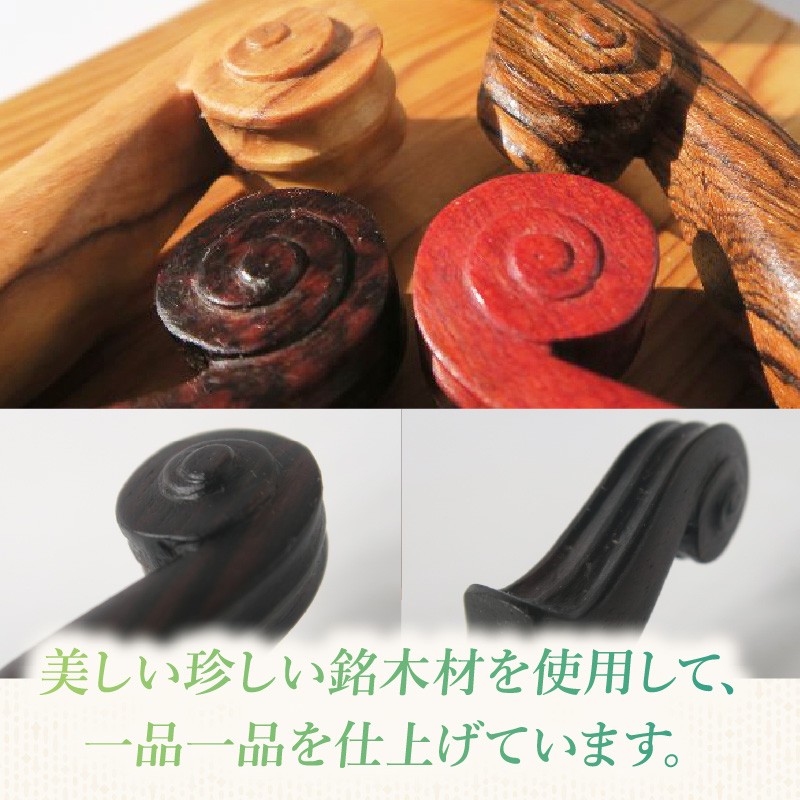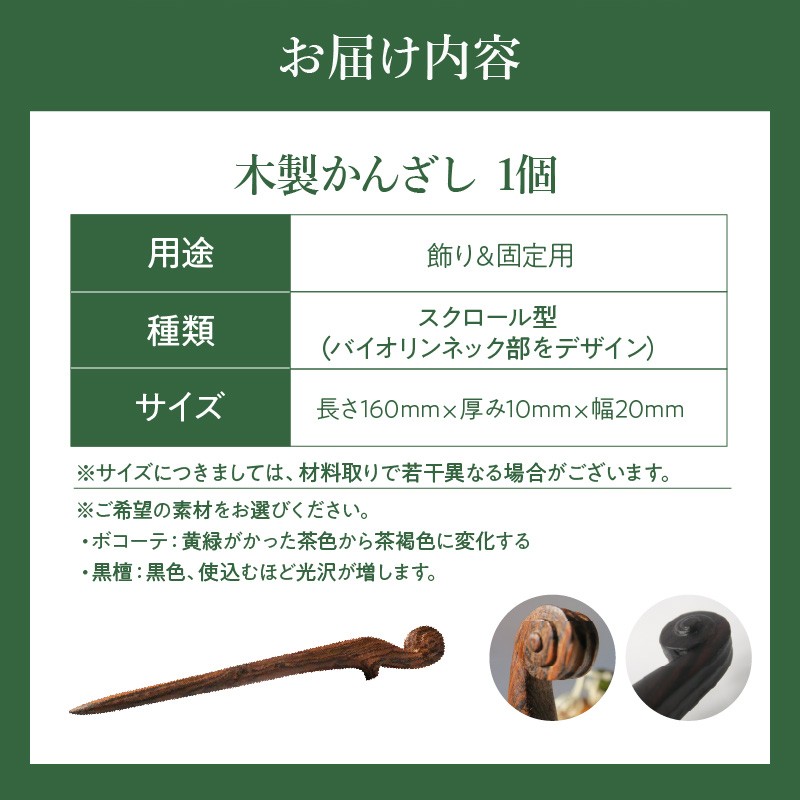 | 容量 | 木製かんざし 1個 ・用途:飾り&固定用 ・種類:スクロール型(バイオリンネック部をデザイン) ・サイズ:長さ160mm x 厚み10mm x 幅20mm ※サイズにつきましては、材料取りで若干異なる場 合がございます。 ※ご希望の素材をお選びください。 ・ボコーテ:黄緑がかった茶色から茶褐色に変化する ・黒檀:黒色、使込むほど光沢が増します。 |