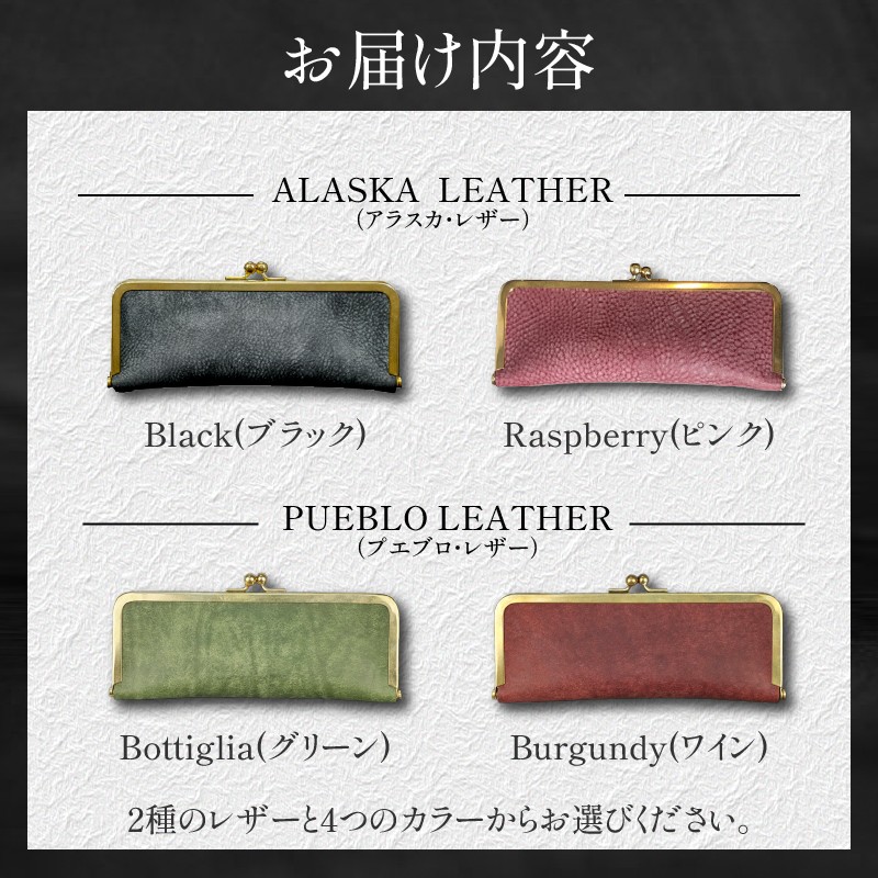 真鍮製のがま口にイタリアのトスカーナ州にあるLa Perla Azzurra社のアラスカを合わせたペンケース。アラスカは天然のシュリンク加工が施され、ロウ引きされた銀面がアーティスティックな印象が魅力。伝統的な鞣し製法「バケッタ製法」にて作られた革のひとつです。オイル分を豊富に含みながらもショルダーのみが使われているので柔軟性と強度に優れています。