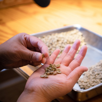 障がい者の方たちの就労支援の作業で、コーヒー豆のピッキングから計量、梱包まで、一つ一つを手作業で行っております。