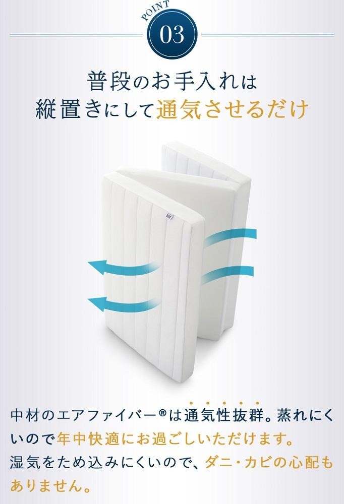 エアウィーヴの特長である寝返りのしやすさや優れた体圧分散はそのままに、一枚敷き可能な三つ折りマットレスです。