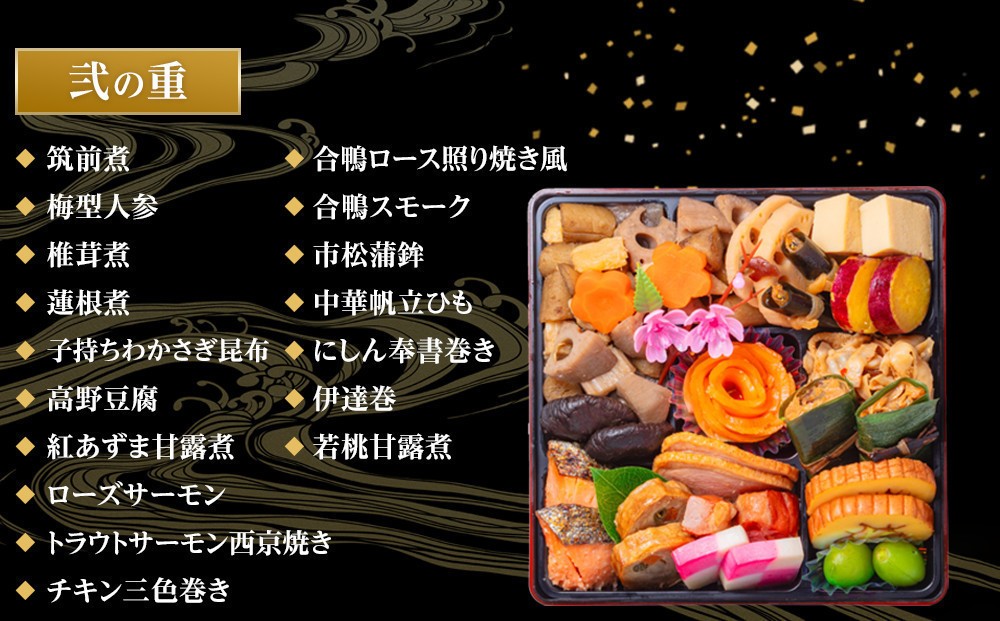 筑前煮、梅型人参、椎茸煮、蓮根煮、子持ちわかさぎ昆布、高野豆腐、紅あずま甘露煮、ローズサーモン 、トラウトサーモン西京焼き、チキン三色巻き、合鴨ロース照り焼き風、合鴨スモーク、市松蒲鉾、中華帆立ひも、にしん奉書巻き、伊達巻、若桃甘露煮