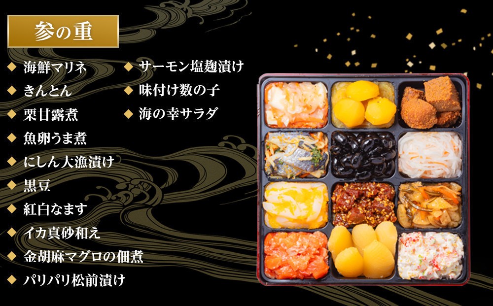 海鮮マリネ、きんとん、栗甘露煮、魚卵うま煮、にしん大漁漬け、黒豆、紅白なます、イカ真砂和え、金胡麻マグロの佃煮、パリパリ松前漬け、サーモン塩麹漬け、味付け数の子、海の幸サラダ