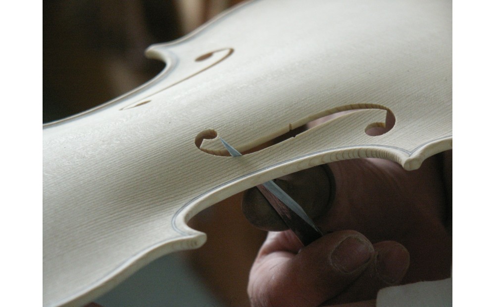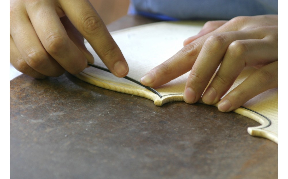 バイオリンのオモテ板となるスプルース材を削り出し、アルコールニスを刷毛塗りし、完成品をさらに磨き上げることでグロッシーな仕上げに完成しております。