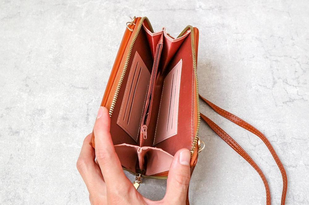 出し入れしやすい横型の「お財布機能」付きのスマホショルダーです。