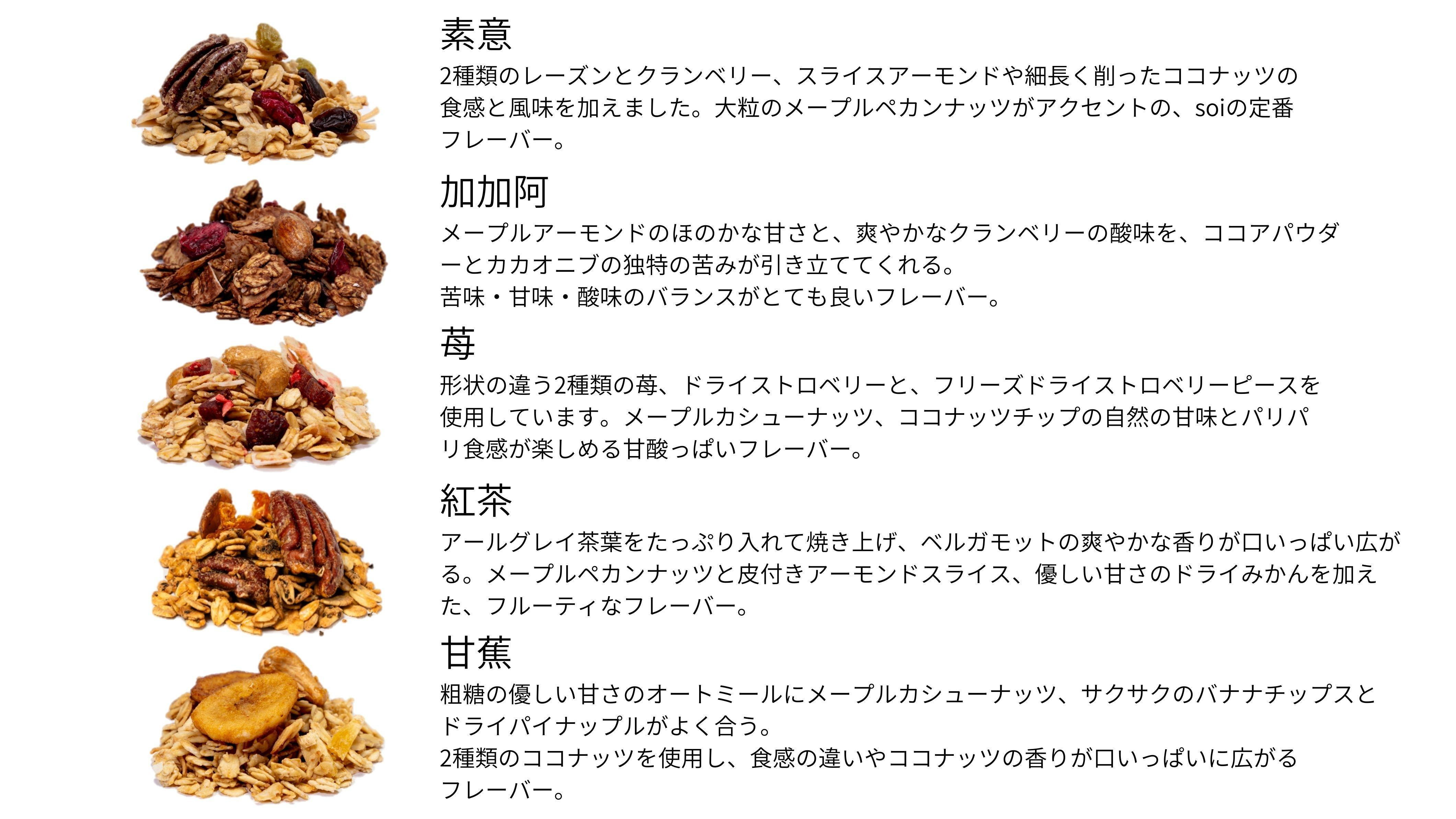 | 容量 | soi グラノーラ 10個 セット (素意・加加阿・苺・紅茶・甘蕉/50g 各種2個) <原材料> 素意:有機オートミール(アメリカ産) 粗糖(種子島産) 有機ペカンナッツ(有機メープルシロップ 塩) 有機レーズン 有機クランベリー(有機砂糖 有機ひまわり油) 有機ココナッツ 有機アーモンド 有機ココナッツオイル 玄米粉(国産) グリーンレーズン 加加阿:有機オートミール(アメリカ産) 粗糖(種子島産) 有機アーモンド(有機メープルシロップ 塩) 有機クランベリー(有機砂糖 有機ひまわり油) 有機ココナッツ 有機ココナッツオイル 玄米粉(国産) 有機カカオニブ 有機ココアパウダー 苺:有機オートミール(アメリカ産) 粗糖(種子島産) 有機カシューナッツ(有機メープルシロップ 塩) ドライストロベリー(りんご濃縮果汁) 有機ココナッツチップス 有機ココナッツオイル 玄米粉(国産) フリーズドライストロベリー いちごパウダー(デキストリン) 紅茶:有機オートミール(アメリカ産), 粗糖(種子島産), 有機ペカンナッツ(有機メープルシロップ, 塩), 和歌山県産温州みかん(砂糖/酸味料), 玄米粉(国産), 有機アーモンド, 有機ココナッツオイル, 紅茶(香料/ベルガモットオイル) 甘蕉:有機オートミール(アメリカ産) 有機バナナ(有機ココナッツ油 有機ココナッツシロップ) 粗糖(種子島産) 有機カシューナッツ(有機メープルシロップ 塩) 有機ココナッツ 有機ココナッツオイル 玄米粉(国産) 有機パイナップル |