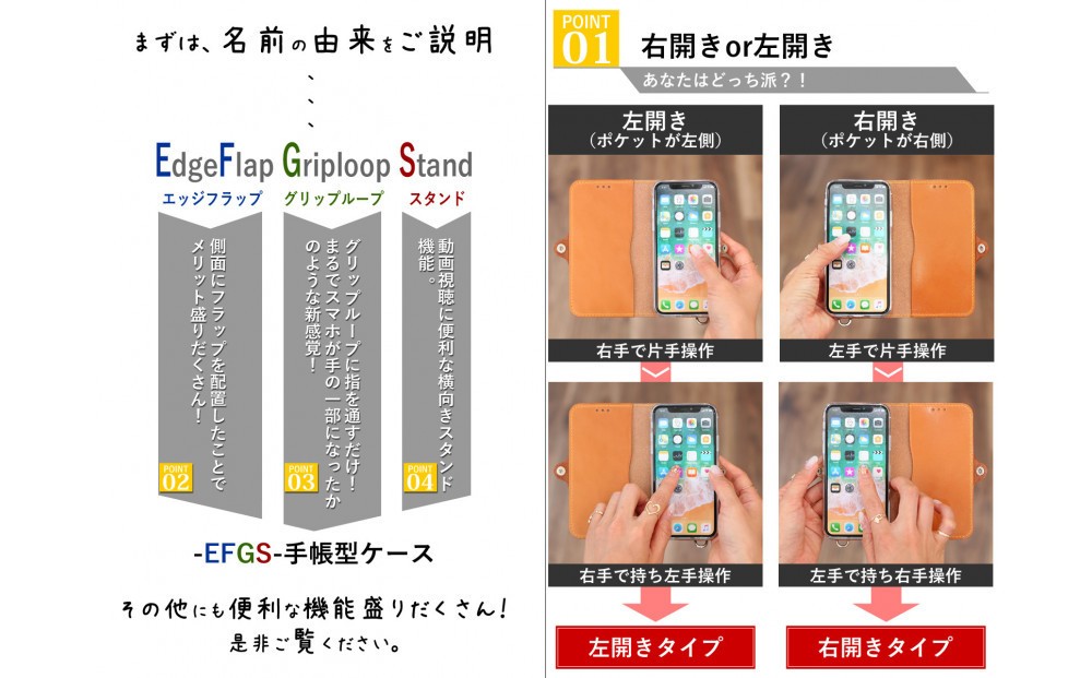 スタンド機能・グリップループ・MSカードポケットなど他のレザーケースには無いオリジナル仕様、某有名ECサイトでは栃木レザースマホケースと言えば Ricky’s Leather と言われるほど人気アイテムです。