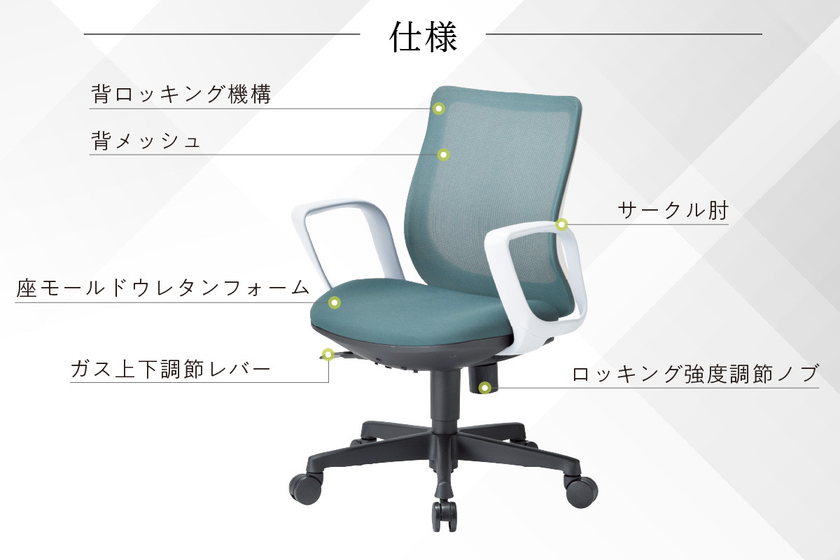背にはメッシュ素材を使用しており、身体を優しく受け止めます。座面はモールドウレタンによる立体造形です。