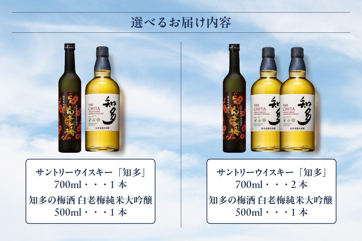 軽やかな味わいとほのかな甘い香りのウイスキーと爽やかな梅の香味と熟成された梅酒 【選べる本数】サントリーウイスキー「知多」、知多の梅酒「白老梅」純米大吟醸のセット│お酒 シングルグレーンウイスキー ハイボール 酒 梅酒 白老梅 suntory 澤田酒造 宅飲み 家飲み おうち時間 晩酌 特産品 贈り物 贈答 ギフト お取り寄せ アルコール 愛知県 知多市