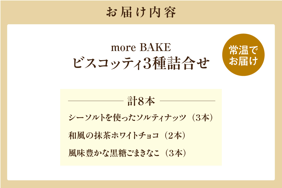 | 容量 | ビスコッティ(焼き菓子) 3種詰合せ(8本) ごまきなこ3本、ソルティナッツ3本、抹茶2本 |