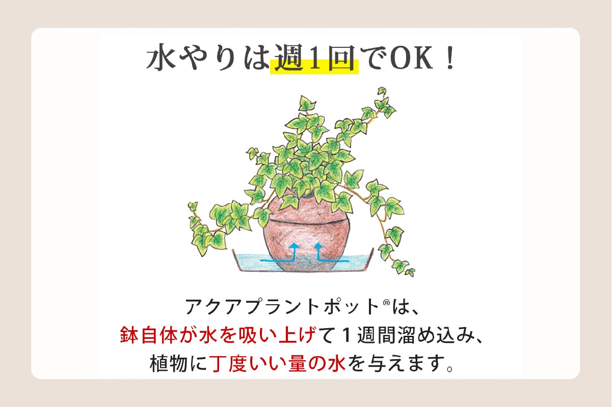 1週間に1回受け皿に水を入れるだけで、アクアプラントポットが水分コントロールを行うため面倒な水やりが大幅に軽減でき元気に植物が育ちます。
