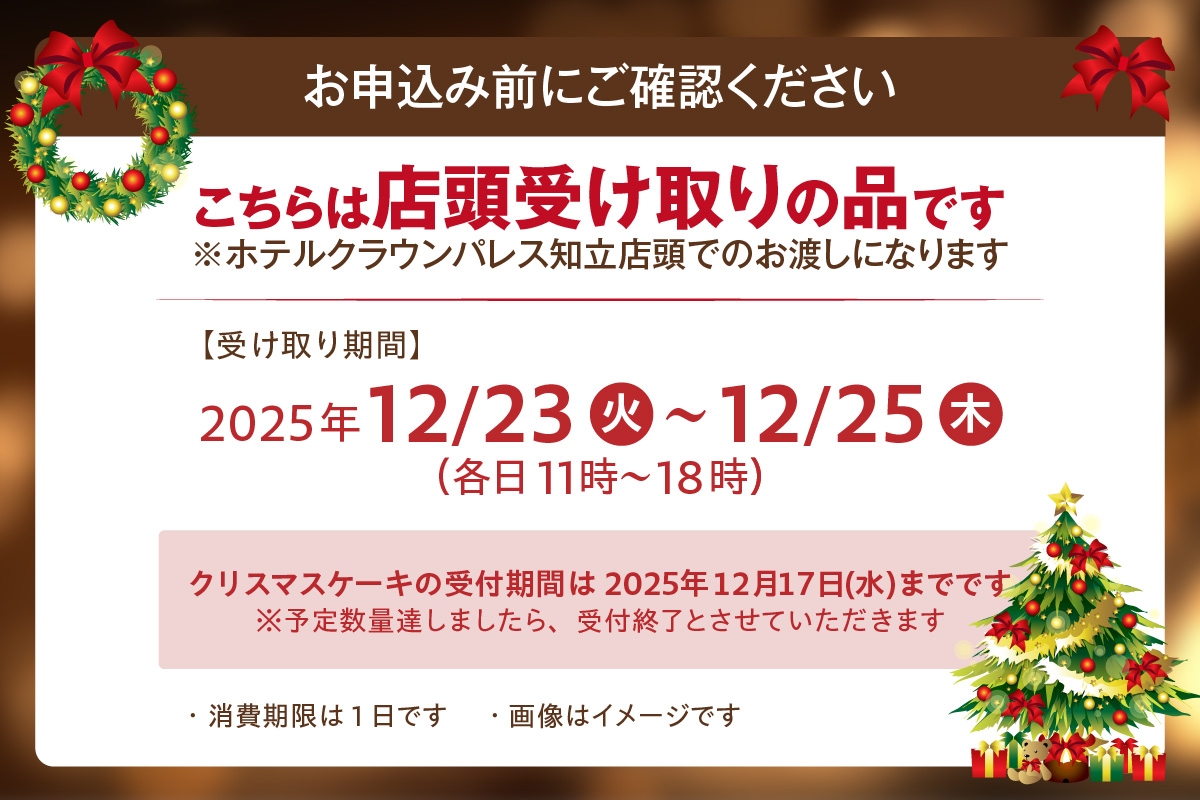 ホテルクラウンパレス知立店頭お渡し限定です。 ※配送希望は承れません。 【提供期間】 12月23日~12月25日まで(11時~18時) |