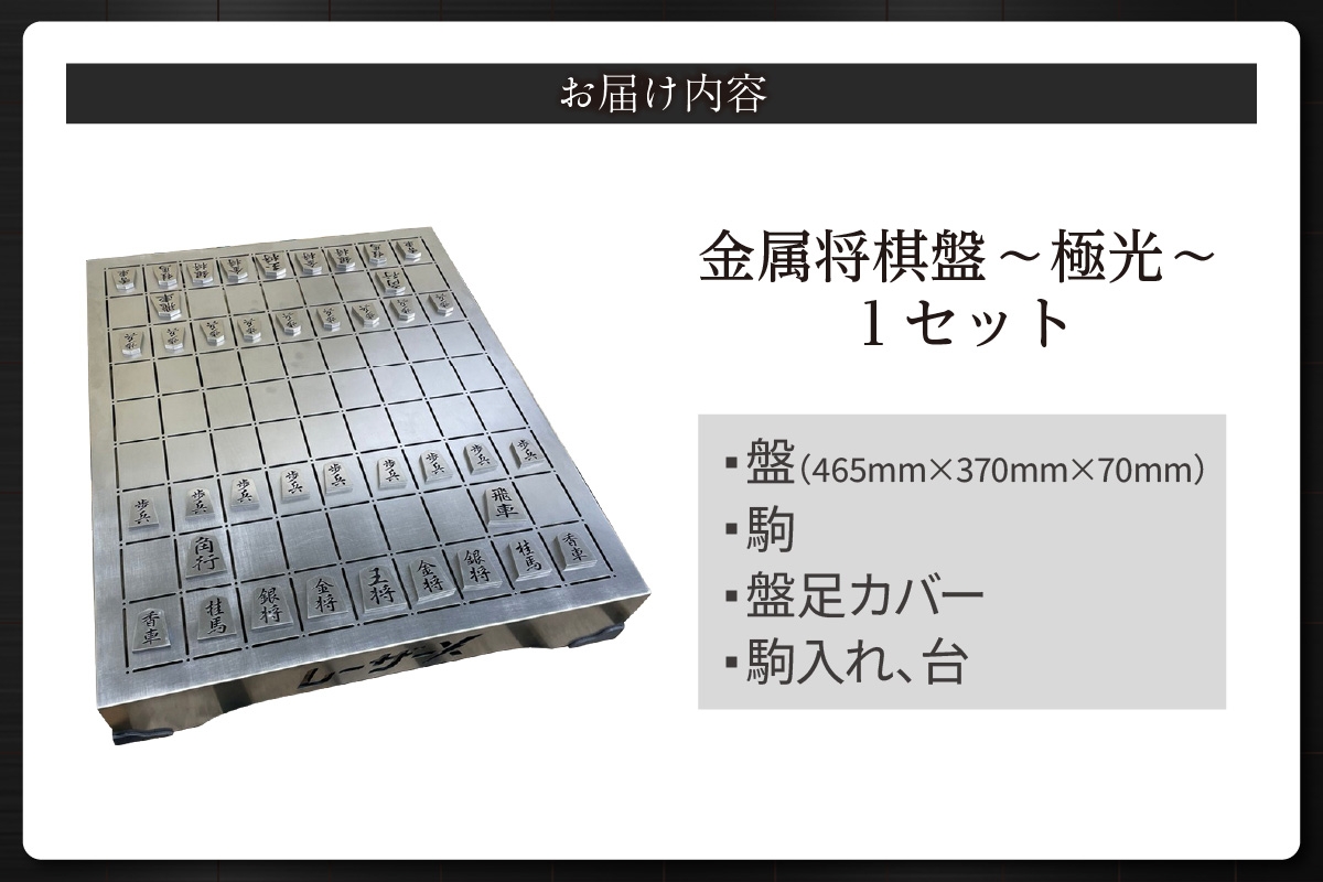 | 容量 | 金属製の将棋盤 ●盤 素材:18-8 ステンレス(SUS304) 寸法:465mm×370mm×70mm 重さ:5.6kg ※駒・駒入れ含む ●駒(代表として王将) 素材:18-8 ステンレス(SUS304) アルミニウム(黒アルマイト) 寸法:35mm×30mm×4mm ●駒入れ・台 素材:18-8 ステンレス(SUS304) 寸法:φ120mm×20mm ●盤足カバー 素材:カーボン PLA材 |