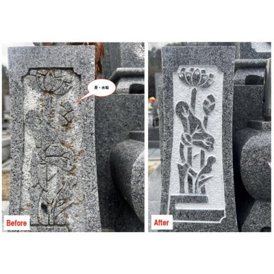 墓石クリーニングでは、墓石を傷つけないように特殊な洗浄液で水垢、苔を取り除き、丁寧に手磨きで水洗いいたします。その後、文字入れ(白ペンキ)し、きれいな状態を長持ちさせる為に撥水コーティングいたします。