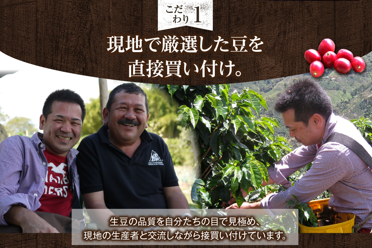 当店では、そんな本当においしいスペシャルティコーヒーを直接現場へ出向き、厳選して買い付け、独自の技術で焙煎し皆様のもとへお届けしています。