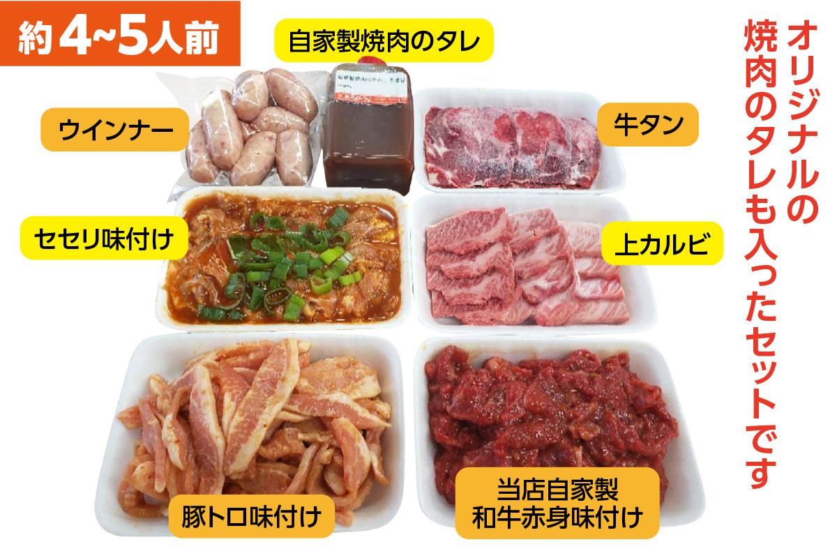 ※和牛赤身味付け肉、トントロ味付け、セセリ味付け、赤身和牛A5ランク上カルビ、牛タン、ウインナー、自家製焼き肉のタレ、各1パック入りです。