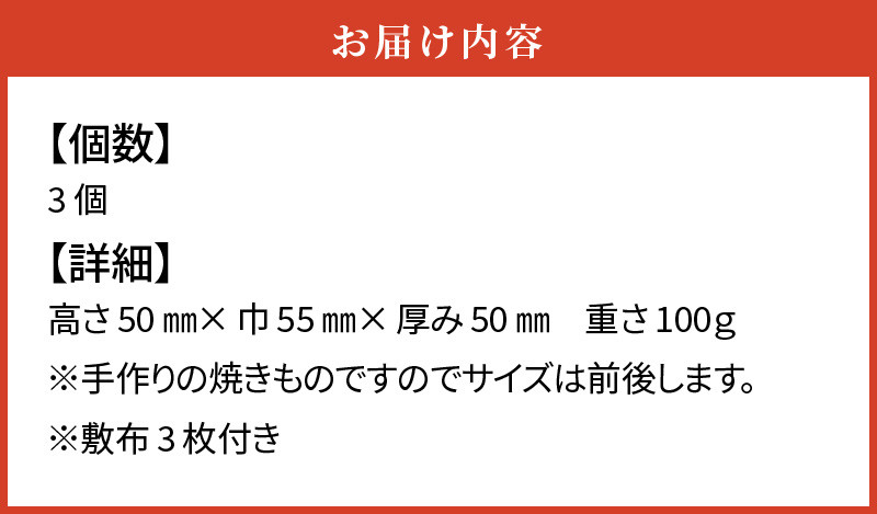| 容量 | 3個 (敷布3枚付き) サイズ:高さ50mm×巾55mm×厚み50mm 重さ100g ※手作りの焼きものですのでサイズは前後します。 ※作業工程の一部に経済産業大臣指定「三州鬼瓦工芸品」として製作条件で認められている自社製作の石膏型を使って成形しています。 |