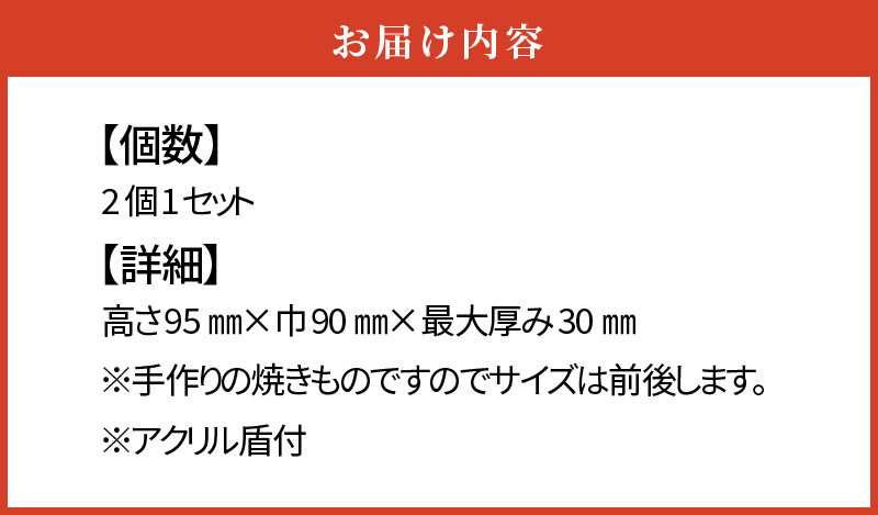 | 容量 | 2個1セット サイズ H95mm×W90mm×最大厚み30mm ※手作りの焼きものですのでサイズは前後します。 ※アクリル盾付 ※作業工程の一部に経済産業大臣指定「三州鬼瓦工芸品」として製作条件で認められている自社製作の石膏型を使って成形しています。 |