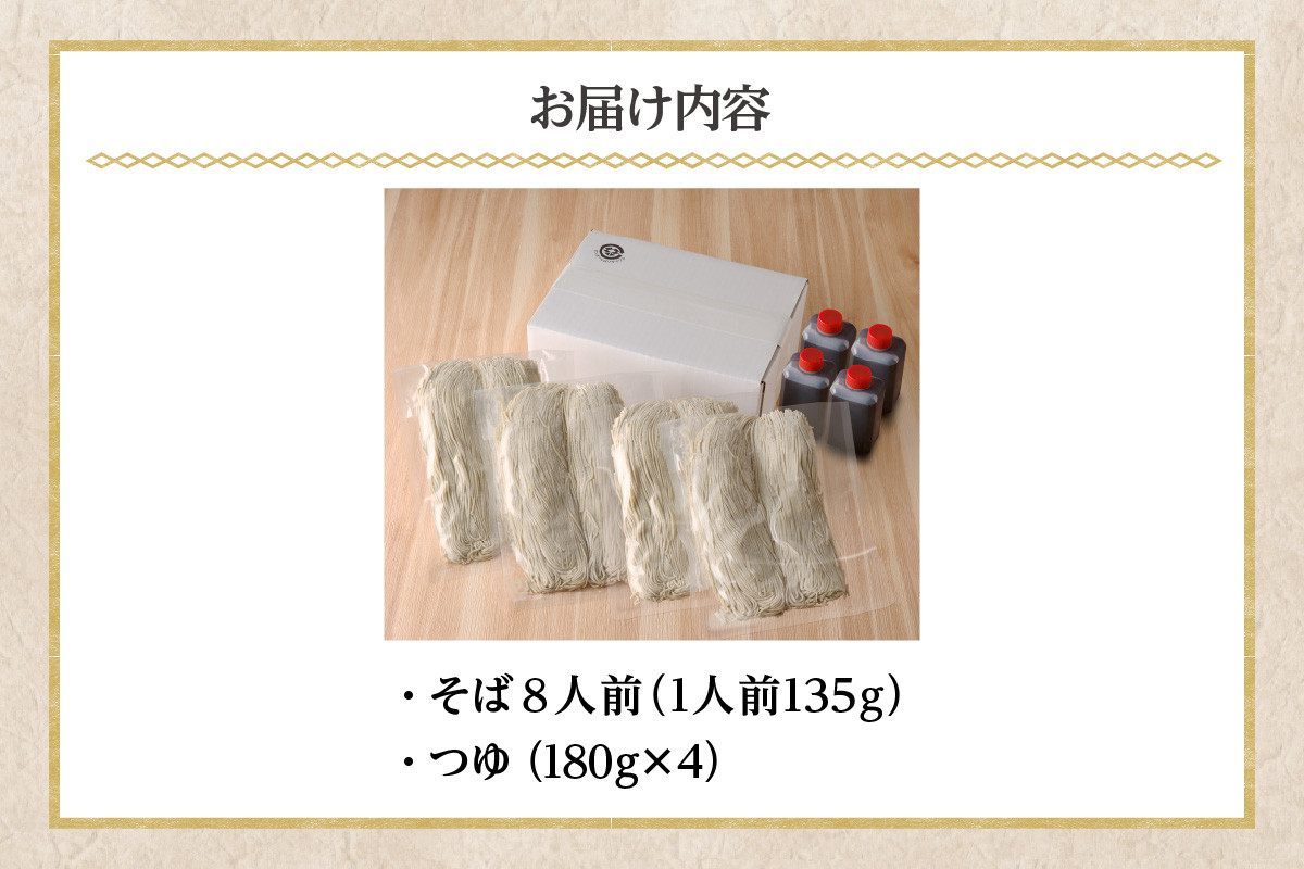| 容量 | そば 8人前(1人前135g) ※1袋に2人前入っています。 つゆ 180g×4  |