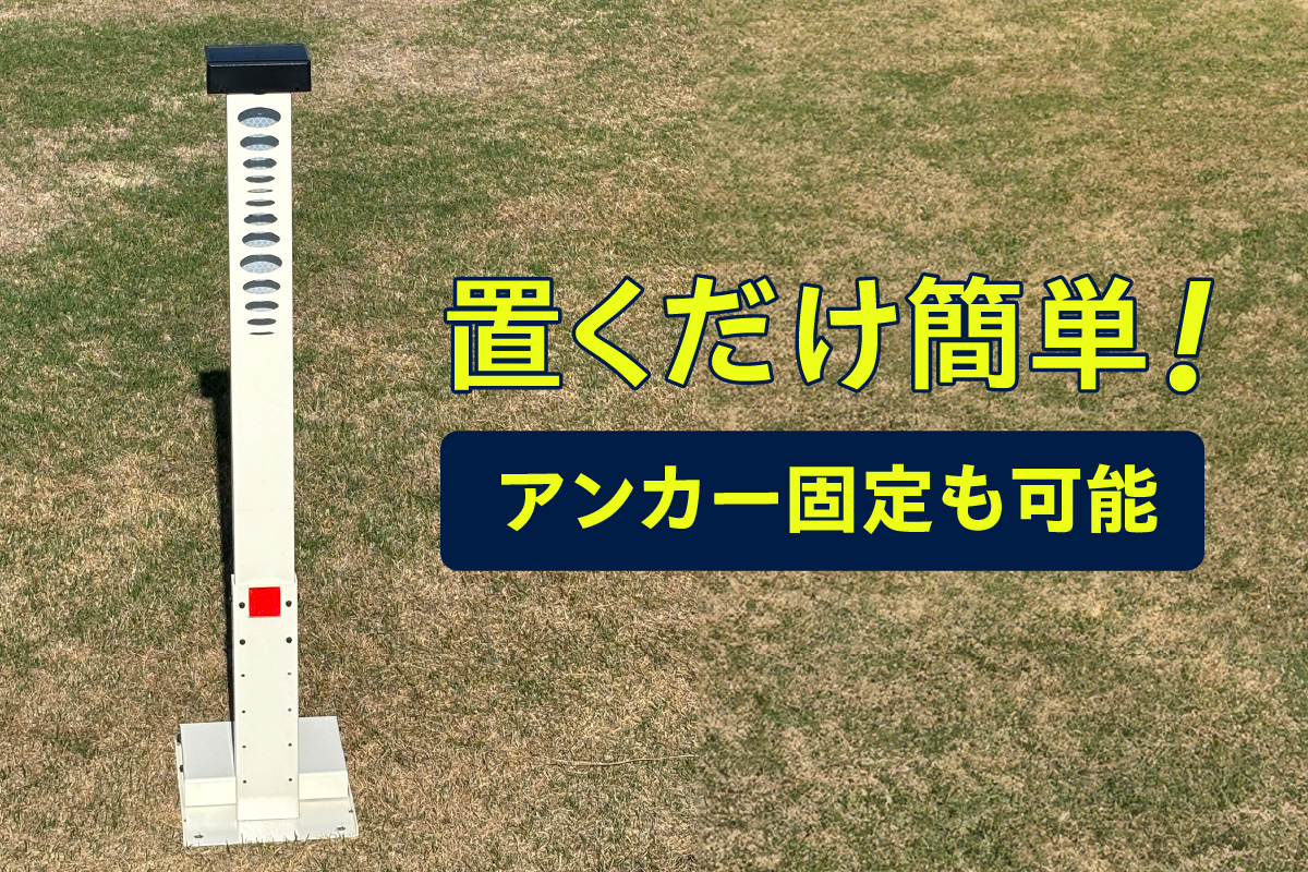 製品の根本部分に、転倒防止用の重りを乗せることにより、本体が倒れずに直立します。 (アンカー固定も可能です)