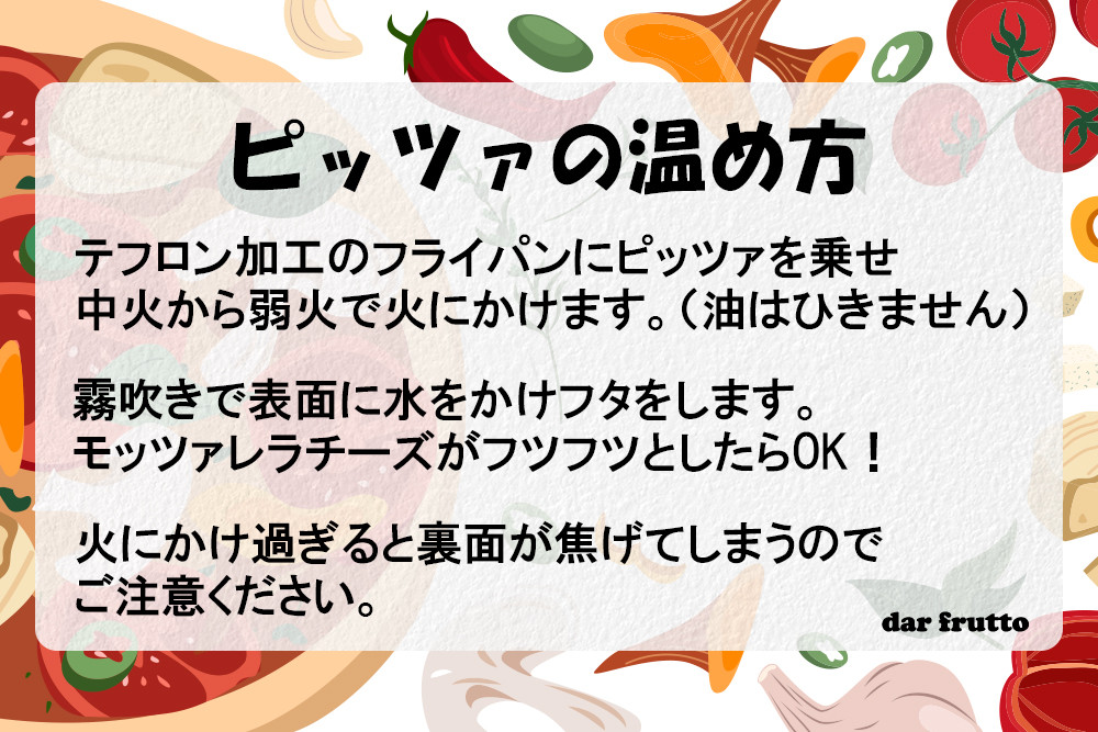 | 容量 | - マルゲリータ(トマトソース・モッツァレラチーズ・バジル) 2枚(直径約23cm) - クワトロフォルマッジョ(クリームソース・モッツァレラチーズ・パルミジャーノ・リコッタ) 1枚(直径約23cm) - ボロネーゼ(トマトソース、ミートソース、ナス、オリーブ、モッツァレラチーズ) 1枚(直径約23cm) |