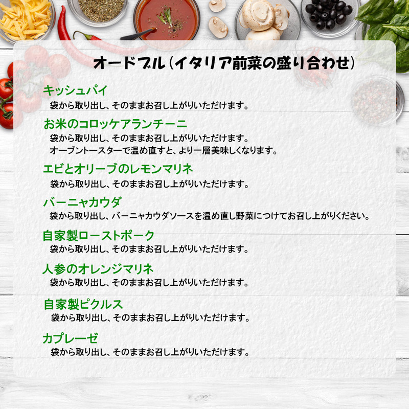 | 容量 | - 名古屋コーチン卵を使った濃厚カルボナーラ 2名分 - フレッシュトマトソースの自家製手打ちパスタ 2名分 - イタリアの焼き菓子、自家製のビスコッティ 1箱(8枚) - オードブルセット 1セット ・ニンジンのオレンジマリネ ・水牛のモッツァレラチーズとチェリートマトのカプレーゼ ・ベーコンとタマネギのキッシュパイ ・パルミジャーノチーズとトリュフ風味のお米のコロッケアランチーニ ・自家製ピクルス ・小エビとオリーブのレモンマリネ ・国産豚ロースの自家製ローストポーク ・バーニャカウダ |