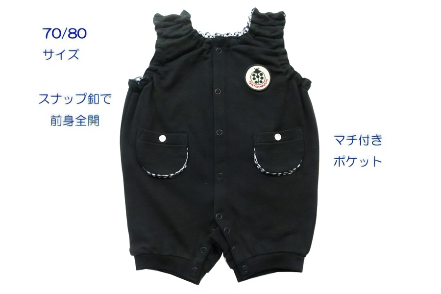 とても柔らかく、脱ぎ着せがしやすい。 TENTOUMUSHI パイルワッペンロンパース・黒・80サイズ|子供 服 赤ちゃん ベビー スナップ 釦 ボタン 肩ひも 綿 国産 日本製 お祝い てんとう虫 [0810]