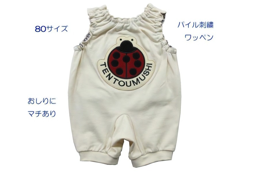 とても柔らかく、脱ぎ着せがしやすい。 TENTOUMUSHI パイルワッペンロンパース・アイボリー・80サイズ|子供 服 赤ちゃん ベビー スナップ 釦 ボタン 肩ひも 綿 国産 日本製 お祝い てんとう虫 [0812]