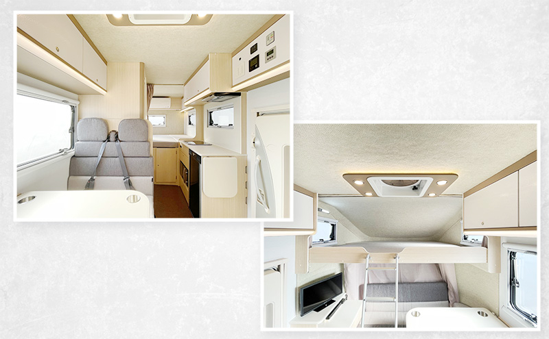 前面の空気抵抗を抑えたルーフ形状。装備を充実させてリヤダブルベッドの二人旅仕様のレイアウト!
