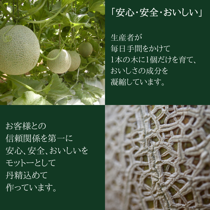 近年農業にもいろいろな栽培技術が導入されていますが、w私たちは特に土壌にこだわり、土を五感で感じ、長年の経験と最新の栽培技術も取り入れ、美味しいメロン作りに励んでいます。一本の木に一個だけを育て、おいしさの成分を凝縮しています。