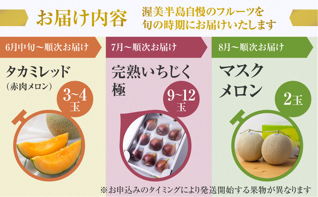 旬の時期にお届けします。 タカミレッド:6月中旬~下旬 イチジク:7月~8月 マスクメロン:8月~9月 ※お申込のタイミングにより、発送開始する果物が異なります。 ※お申込みのタイミングにより、お届けが翌年となる場合がございます。 ※生育状況により遅延する可能性がございます。ご了承ください。 ※沖縄、離島など一部、配送不可のエリアがございます。※ |