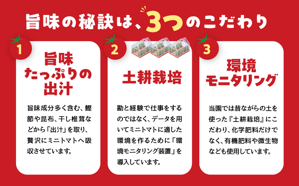 トマトには『グルタミン酸』という旨味成分を多く含んでいます。そこで旨味成分をたくさん含む、かつお節や昆布、干し椎茸などから『出汁』を取り、定期的に水と一緒にミニトマトに与えて、「旨味」を高めています。そのままで食べるのはもちろん、お菓子のかわりに食べられる方も多くいます。また、旨味成分が高く、味が濃いため料理で使うと料理がより一層美味しくなります。