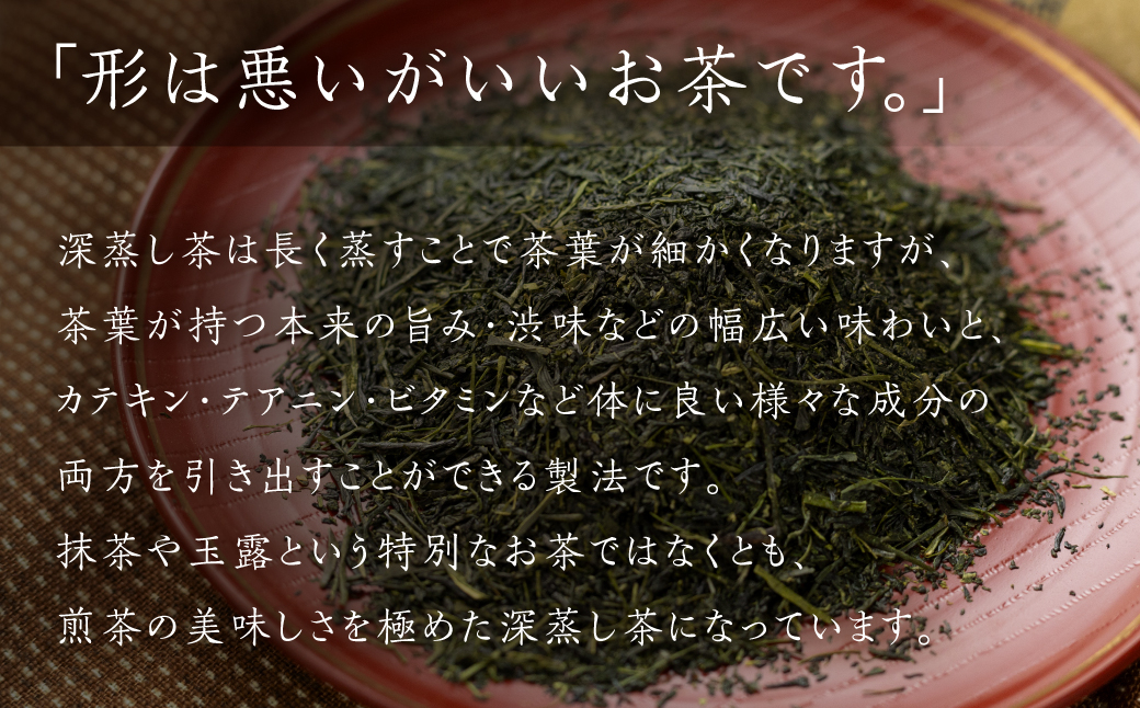 濃厚な味わい、円やかな旨み、爽やかで上品な香りのバランスの取れた、何杯でも飲みやすい深蒸し茶です。田原市産100%です。