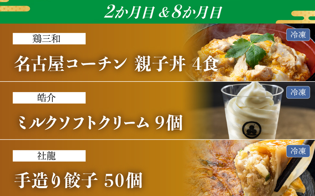 渥美半島の恵みが感じられる定期便です。 毎月1回ずつお届けします。 ■1回目:青うなぎ 蒲焼き 2尾 約300g(原産地 中国/日本/台湾) 全国有名店御用達うなぎ卸専門問屋が贈る至高の青うなぎ 独自の基準による厳しい審査をクリアした国内外複数の契約養殖場より厳選して仕入れをし、職人が1本ずつ最終チェックをした活饅を熟練した職人が一本一本丁寧に焼き上げます。 ■2回目:極甘トウモロコシ使用 コーンスープ 5袋 1袋にとうもろこし1本半~2本を使った本格コーンスープです。洋食屋さんで注文したようなコーンスープは自宅で作ると意外と手間がかかるのですが、これなら簡単調理。コーンクリームコロッケやコーンクリームカルボナーラなどのアレンジ料理や、キャンプのお供に。レトルトなので賞味期限も1年間あるので非常食にも。原材料はとうもろこしと水と塩のみ、離乳食を始めた赤ちゃんでも楽しめる物を目指しました。 ■3回目:無添加 手造り餃子 50個 素材にこだわりぬいた唯一無二の餃子。 自家製ニンニクは収穫後、自然乾燥させ水分と旨味のバランスが最も良いタイミングで皮をむき冷蔵保存します。 そうすることでニンニクの品質が安定し、餃子の味に深みとパンチを与えます。 ■4回目:名古屋コーチン 親子丼 4食 鶏専門店【鶏三和】の名古屋コーチン親子丼 予め名古屋コーチンを切り身にし鶏三和の親子丼のたれをセットにした、小分けタイプです。ご飯とたまごはご自身でご用意をお願いします。 ・鶏専門店のこだわりの味 弾力があり、鶏の旨味が強い名古屋コーチンの肉を100%使用。たれは、かつお節・ムロ節・煮干しエキスを使い、本醸造醤油に醤油麹を入れ、深みのある優しい甘さの本みりんを使用しました。肉もたれも自信を持っておすすめできる一品です。 ■5回目:あつみのお手軽クッキングセット こだわり惣菜4種類のセットです。 レンチンまたは湯煎で温めて、ごはんにかけるだけで本格的なお店の味をご家庭で楽しめます。 冷凍庫にストックしておけば、忙しいときでも手早くおいしいご飯が準備できます。 晩ごはんのおかずはもちろん、お弁当などにも! ※沖縄、離島など一部、配送不可のエリアがございます。※