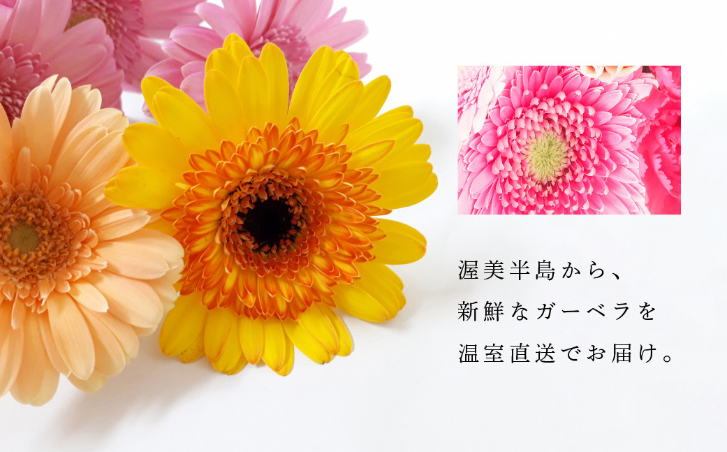渥美半島の温暖な気候と豊富な日照量のもと、温室で温度や湿度等をコントロールし、赤、白、黄、ピンクやオレンジなどの高品質なガーベラを年間を通じて栽培しています。