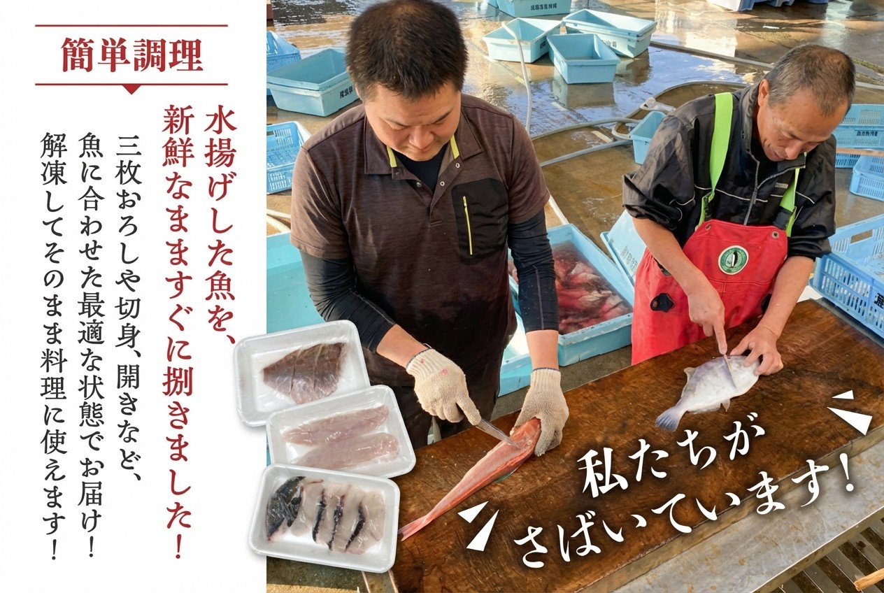 三枚おろし、切り身、開きなど、魚の種類に合わせて最適な状態にしてありますので、解凍後すぐに焼く・煮る・揚げるなど、どんなお料理にも使いやすい便利なセットです。
