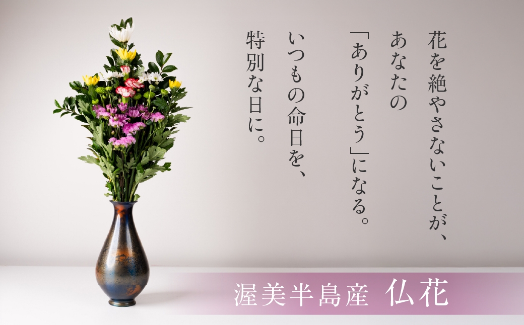 日本一の花のまち・田原市 渥美半島は温暖な気候と豊かな自然に恵まれ、花の生産額は全国トップ。品質の高さと鮮度の良さが自慢です。お墓用に最適な仏花をお届け。