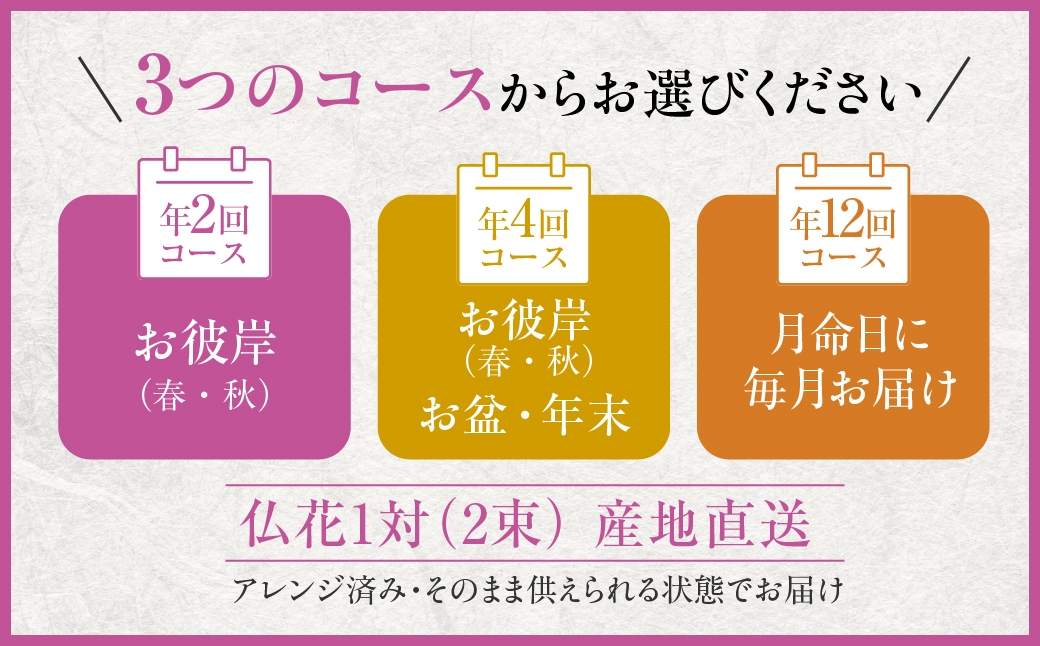 | 容量 | 1回のお届け内容:お墓用仏花 特選 1対(2束) お届け回数:1回・2回・4回・12回 |