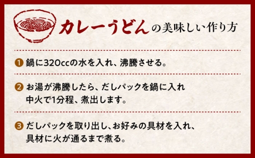 2種類のカレールゥをいくつものスパイスと合わせ、ポテトにて旨味のある自然なとろみが感じられるカレーうどんの素、特許製法をとった技術によってパックされた和風だしと合わせてお召し上がりください。
